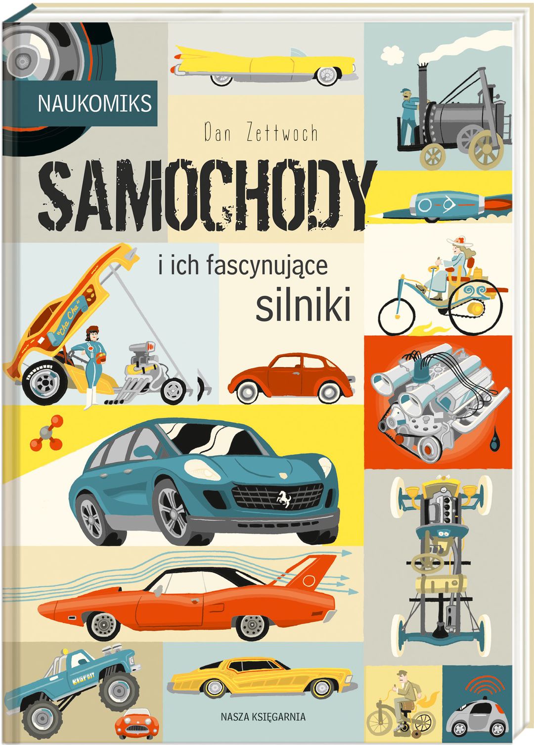 Samochody i ich fascynujące silniki / Dan Zettwoch ; przełożyli Bogumił Bieniok, Ewa L. Łokas. - Wydanie pierwsze. - Warszawa : Nasza Księgarnia, 2022. - 124, [4] strony : ilustracje ; 24 cm.