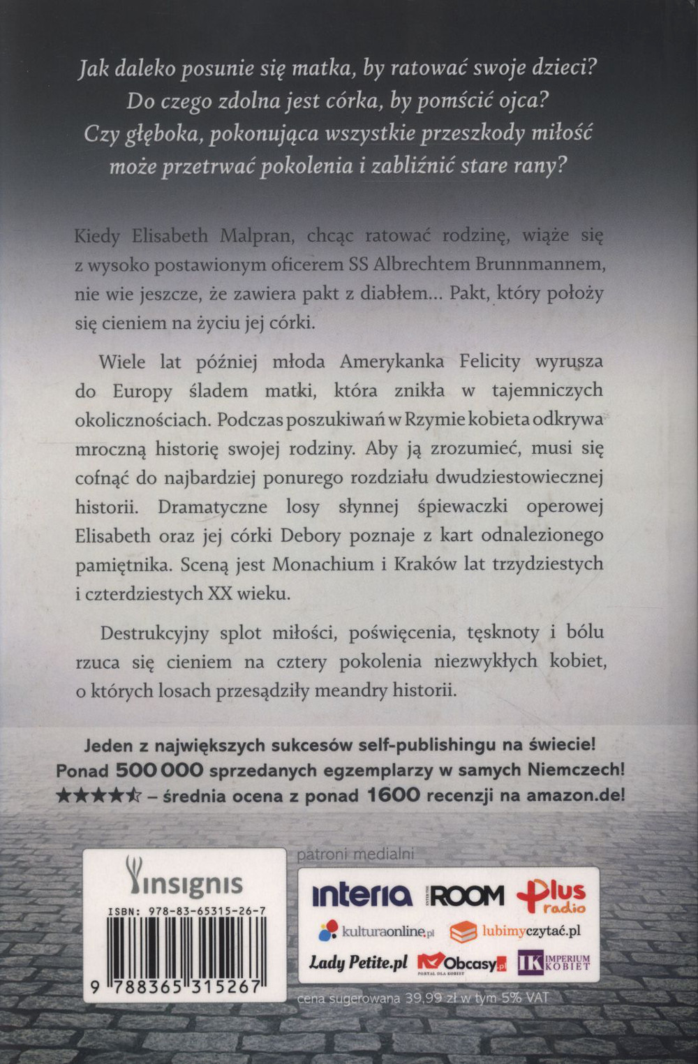 Jak daleko posunie się matka, by ratować swoje dzieci? Do czego jest zdolna córka, by pomścić ojca? Czy głęboka, pokonująca wszystkie przeszkody miłość może przetrwać pokolenia i zabliźnić stare rany? Kiedy Elisabeth Malpran, chcąc ratować rodzinę, wiąże się z SS Obersturmbannführerem Albrechtem Brunnmannem, nie wie jeszcze, że zawiera pakt z diabłem… Pakt, który położy się cieniem na życiu jej córki. Wiele lat później młoda Amerykanka Felicity wyrusza do Europy śladem matki, która znikła w tajemniczych okolicznościach. Podczas poszukiwań w Rzymie kobieta odkrywa mroczną historię swojej rodziny. Aby ją zrozumieć, musi się cofnąć do najbardziej ponurego rozdziału dwudziestowiecznej historii. Dramatyczne losy jej córki Debory poznaje z kart odnalezionego pamiętnika. Scena jest Monachium i Kraków lat trzydziestych i czterdziestych XX wieku. Destrukcyjny splot miłości, poświęceń, tęsknoty i bólu rzuca się cieniem na cztery pokolenia niezwykłych kobiet, o których losach przesądziły meandry historii.